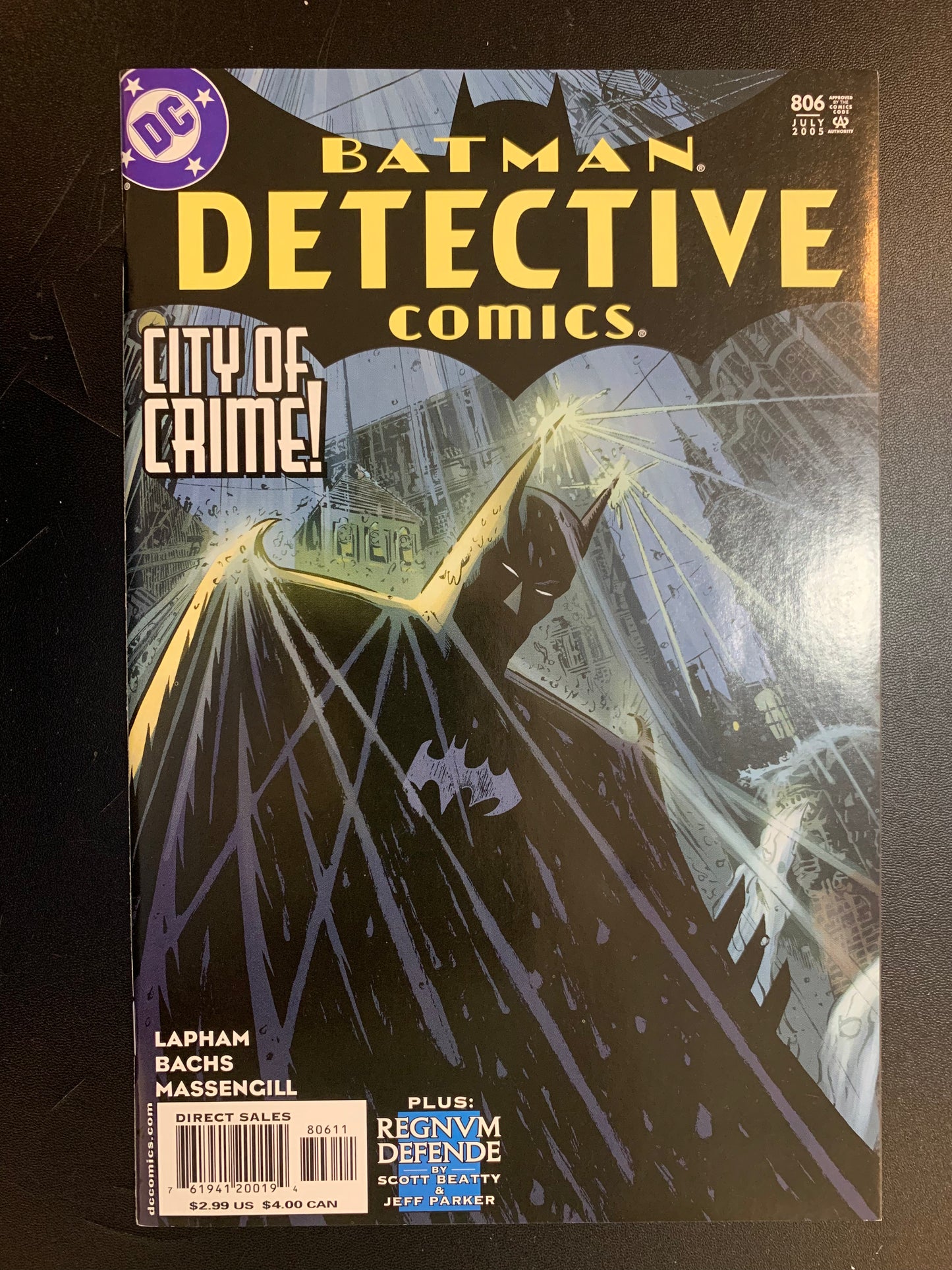 Written by David Lapham and Scott Beatty Art by Ramon Bachs & Nathan Massengill and Jeff Parker Cover by Lapham In Part 6 of the 12-part "City of Crime," the number of missing people is skyrocketing, an army of faceless goons is out for Batman's blood, and the Ventriloquist is homicidal! Plus, part 1 of the 2-part "Regnum Defende," by Scott Beatly and Jeff Parker. 40 pages