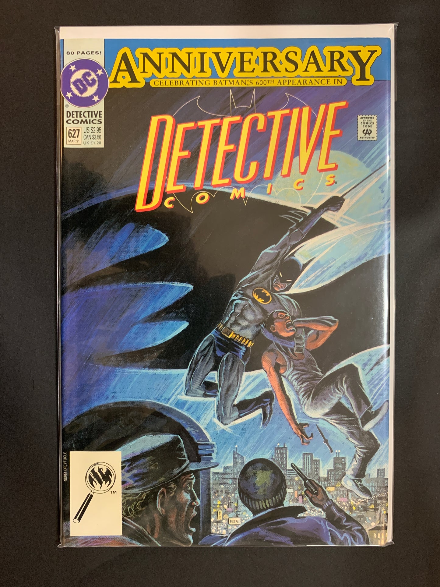 80-pg anniversary issue celebrating Batman's 600th appearance in Detective Comics. Includes a reprint of "The Case of the Chemical Syndicate" from Detective Comics #27 (Batman's first appearance) by Bob Kane & Bill Finger. The rest of the comic features 3 other versions of the same plot, to demonstrate how the Dark Knight has both changed and remained constant. The first of the 3 is "The Cry of Night is - - 'Kill!'" from Detective Comics #387 by Mike Friedrich, Bob Brown & Joe Giella, commissioned in 1969 to commemorate the 30th Anniversary of Batman's debut. The remaining 2 tales are brand new: "The Case of the Chemical Syndicate" by Marv Wolfman, Jim Aparo & Mike DeCarlo, and "The Case of the Chemical Syndicate" by Alan Grant, Norm Breyfogle & Steve Mitchell. Cover by Norm Breyfogle.