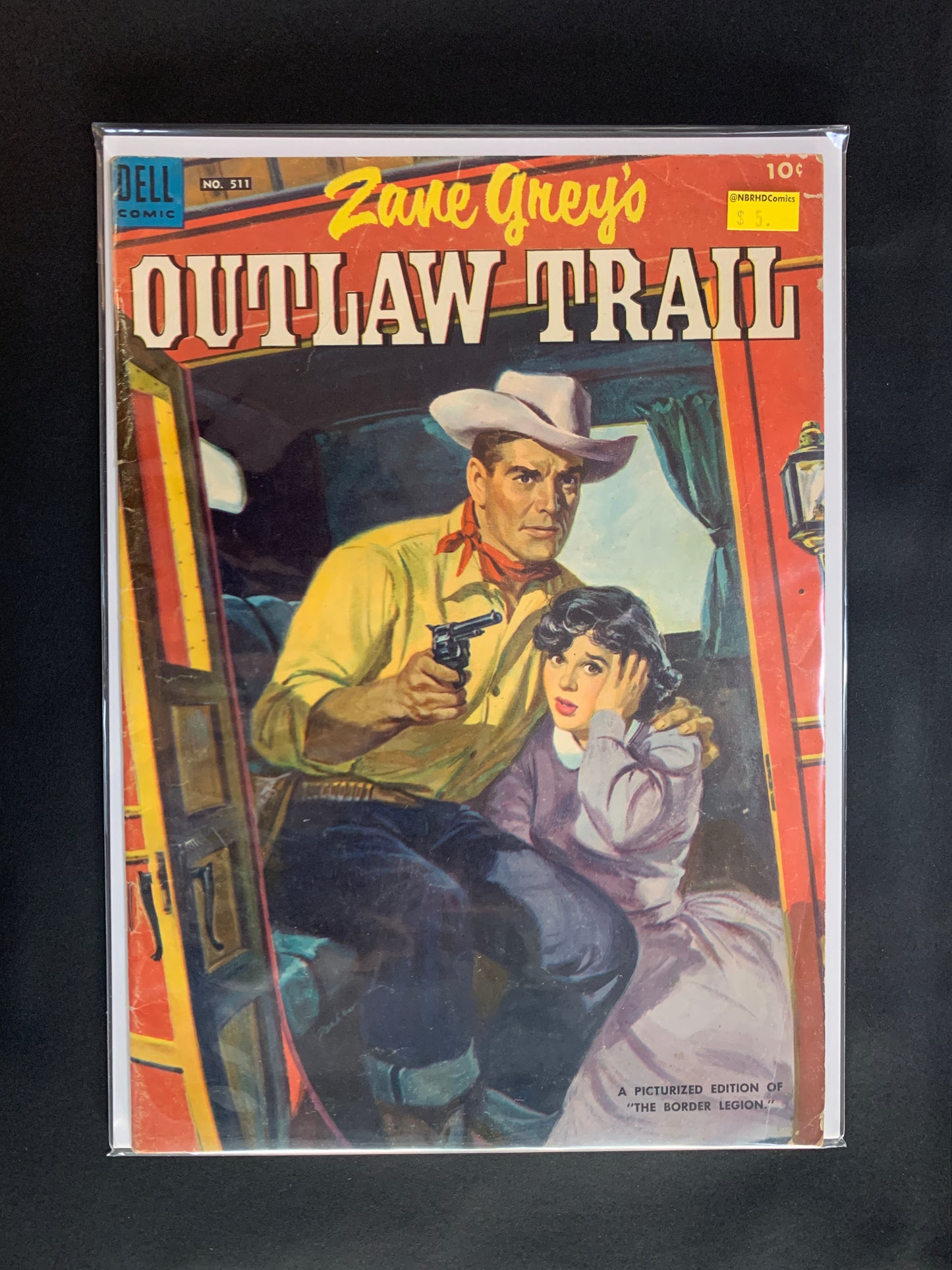 Indicia title is "Zane Grey's OUTLAW TRAIL (The Border Legion), No. 511." Painted cover art. Zane Grey's Outlaw Trail, script by Zane Grey (original story) and Gaylord Du Bois (comic adaptation), art by Everett Raymond Kinstler; Spurned by Joan Randle, Jim Cleve goes to join Jack Kells' gang of outlaws, the Border Legion; Joan follows Cleve, but gets captured by Kells; She poses as Kells' wife when the gang comes to get Kells to go to his ranch on the Idaho border; Cleve comes to join the gang right before they head to Adler Gulch, which has become a boom town because of discovery of a rich gold strike. Adapted from the 1916 novel "The Border Legion" by Zane Grey. 36 pages, full color.