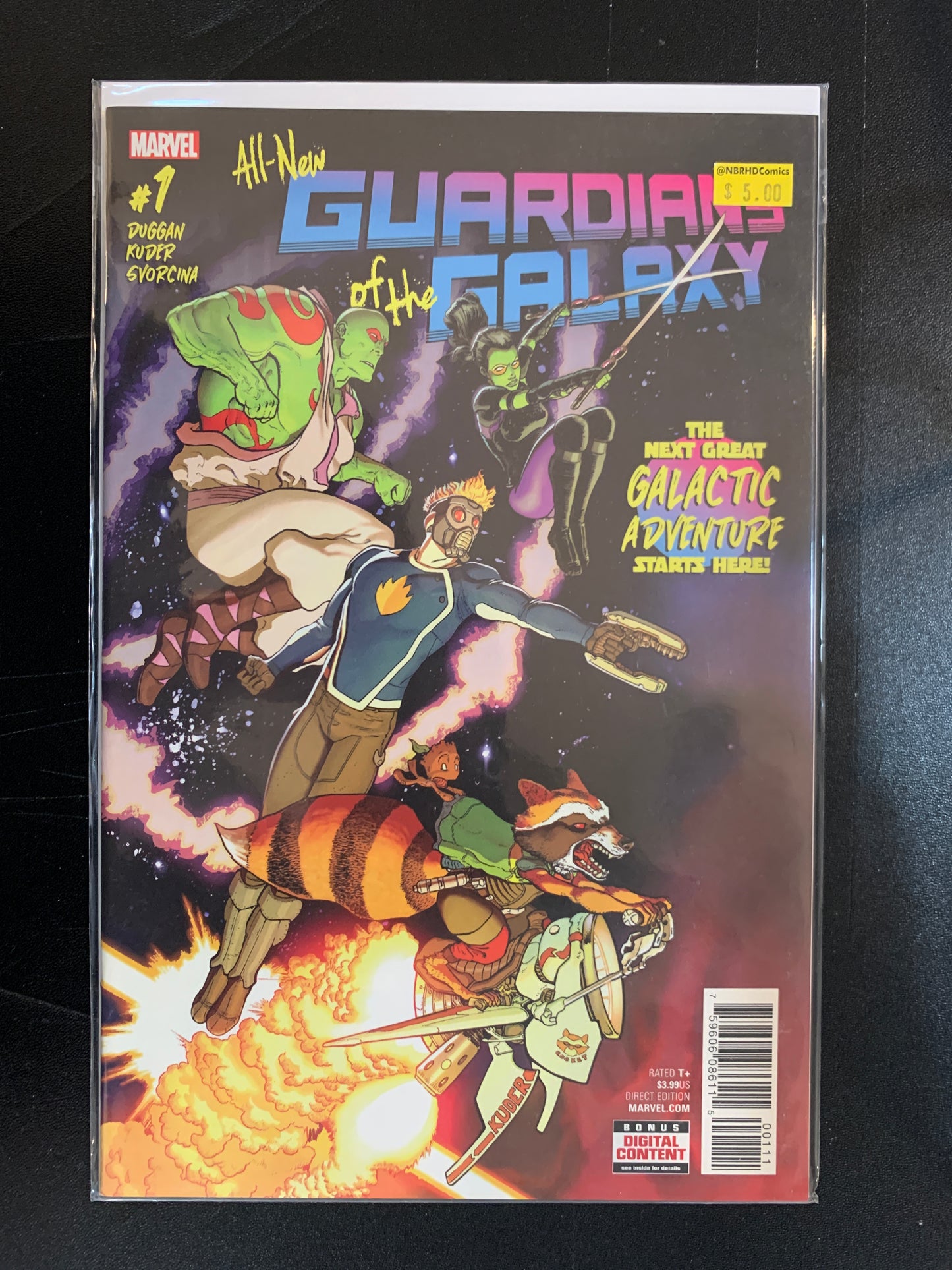 Written by Gerry Duggan. Art and Cover by Aaron Kuder. A NEW ERA OF COSMIC ADVENTURE BEGINS HERE! Double ships every month! The Guardians of the Galaxy have taken off into space once more, on their biggest and weirdest misadventures yet! Kicking things off with the biggest heist they've ever tried, we join Star-Lord, Rocket Raccoon and company as they blast their way through the galaxy, the peacekeepers of the Nova Corps hot on their tails. And once they find themselves caught in a war between The Collector and The Grandmaster, there will hardly be time to explain why Groot can't grow any bigger, what Gamora is searching for or why Drax has sworn off violence! But don't worry, we will - with a new twice-monthly schedule, All-New Guardians of the Galaxy has space for ALL your Marvel Cosmic needs! 36 pages, full color. Rated T+