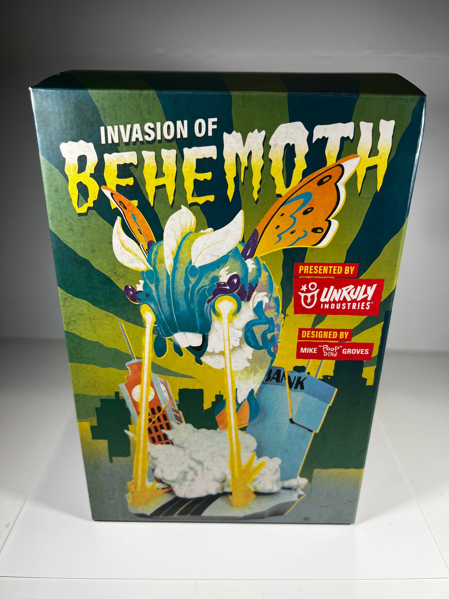 Hide your sweaters from the Invasion of the BeheMOTH! This dynamic designer toy by Mike “Poopbird” Groves floats like a butterfly, but stings like a giant laser-eyed kaiju intent on destroying the city.