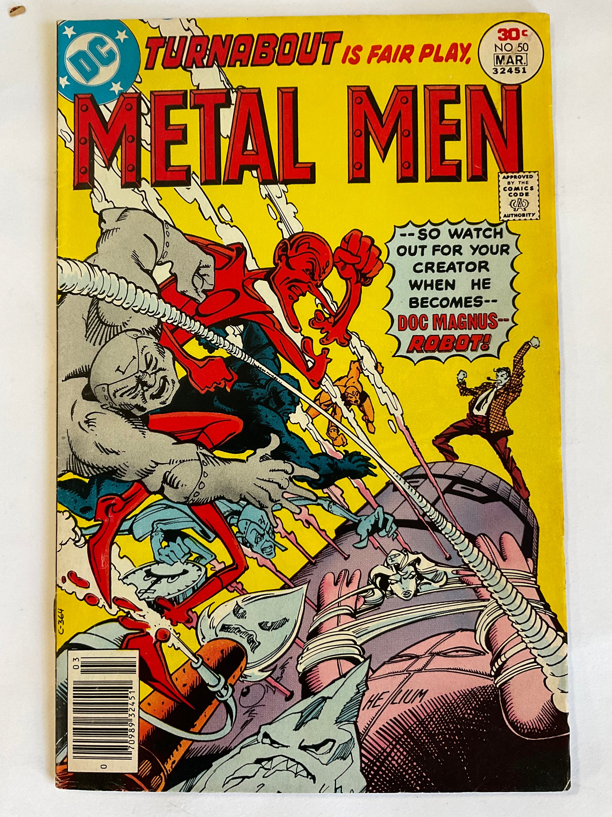 Cover art by Walt Simonson. Our Mentor, the Robot, script by Martin Pasko (pgs. 1-2, 16-17) and Bob Kanigher (pgs. 3-16), pencils by Joe Staton (pgs. 1-2, 16-17) and Ross Andru (pgs. 3-16), inks by Joe Staton (pgs. 1-2, 16-17) and Mike Esposito (pgs. 3-16); Enroute to an Army base, Doc recounts the time he was changed to a robot by cosmic rays and invented the Gas Gang, which the Metal Men had to destroy in self defense. Hostess Cup Cakes ad with Wonder Woman, pencils by Curt Swan, inks by Vince Colletta. Justice For All Includes Children #9 public service announcement starring Superman, pencils by Curt Swan, inks by Vince Colletta