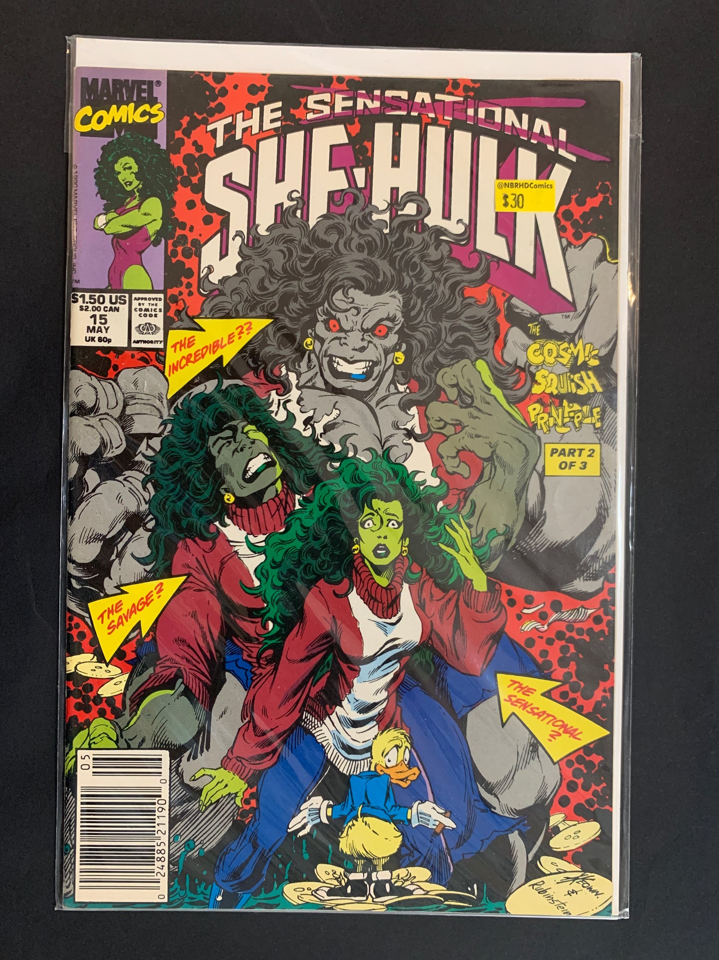 Cover pencils by Dale Keown, inks by Joe Rubinstein. "Secret Warts," script by Steve Gerber, pencils by Bryan Hitch, inks by Jim Sanders III; She-Hulk and Howard the Duck's adventure in the Baloney-verse continues; But when bitten by a horde of angry demons, Shulkie becomes a mindless, smashing killing machine — just like her cousin, the Hulk!