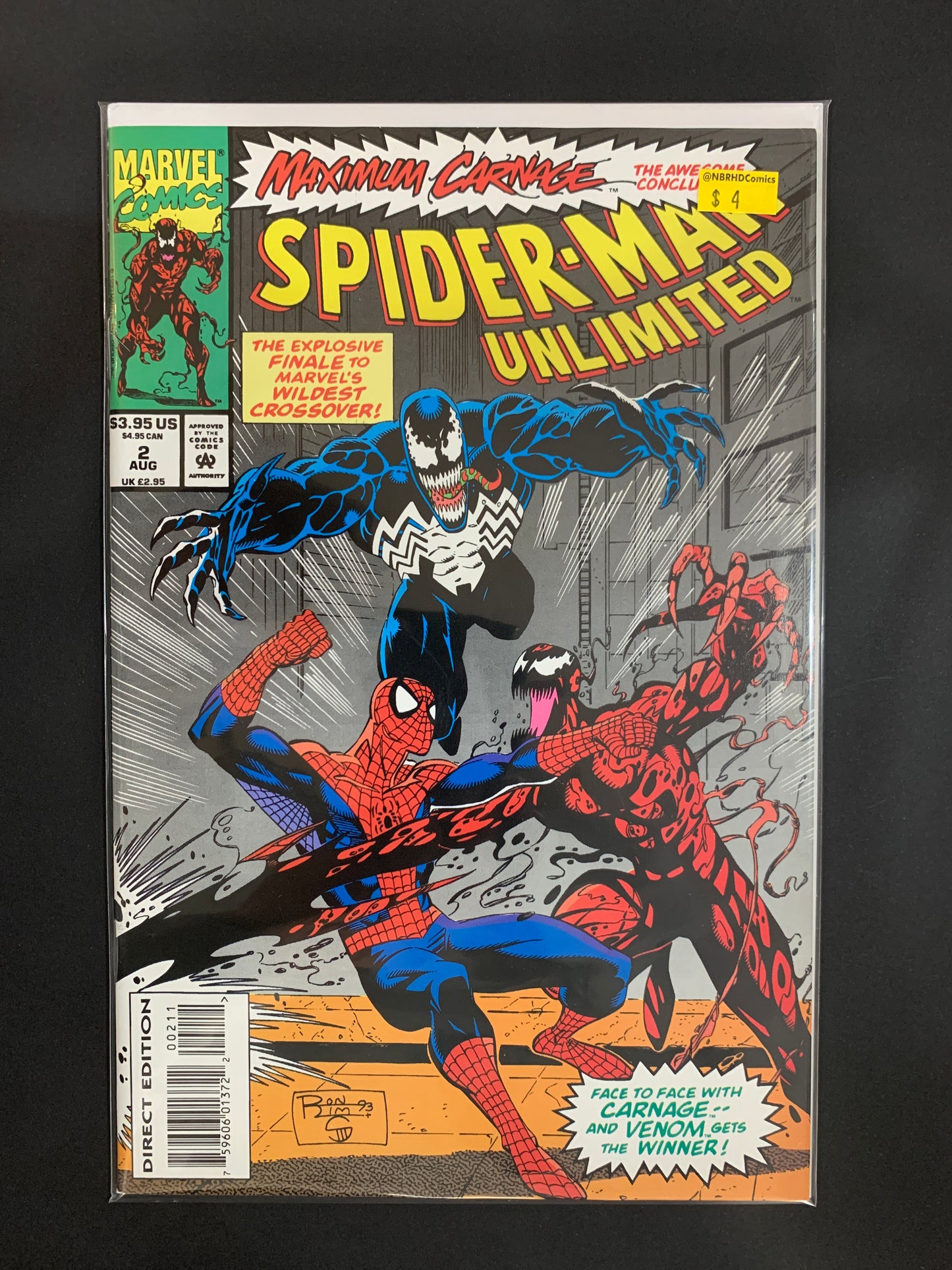 "The Hatred, the Horror and the Hero!" Maximum Carnage, Part 14 of 14. Script by Tom DeFalco. Chapter 1 - Art by Mark Bagley (breakdowns) and Sam de la Rosa (finishes). Chapter 2 - Art by Ron Lim (pencils), Jim Sanders III (inks), and Sam de la Rosa (inks). Cover by Ron Lim and Jim Sanders III. Story continues from Spectacular Spider-Man 203. In shocking fashion Carnage jumps out of Central Park Lake! Oh no, all the police and superheroes (besides the web-slinger) left a while ago thinking the bloodthirsty super-villain was dead! But he's still alive! And that means the Maximum Carnage saga is not over yet! Venom and Spider-Man battle Carnage first in Central Park, then at the St. Estes Home in Brooklyn, and finally in an old cemetery! Can the wondrous wall-crawler at long last corral Carnage? And also keep Venom from killing his symbiote offspring? After fourteen issues there's no telling how this tale will end! Appearances by the Black Cat, Mary Jane Watson, Aunt May, Richard Parker LMD, Mary Parker LMD, Liz Osborn, Normie Osborn, Thunderstrike, Sersi, and the Vision. Cameo appearances by Morbius and Nightwatch. Second Story: "Other People's Dreams." Script by Kurt Busiek. Pencils by Steven Butler. Inks by Bud LaRosa. The web-slinger clashes with Megawatt! Cameo appearance by Mary Jane Watson. Flashback cameos by Daredevil and Dr. Jonas Harrow.