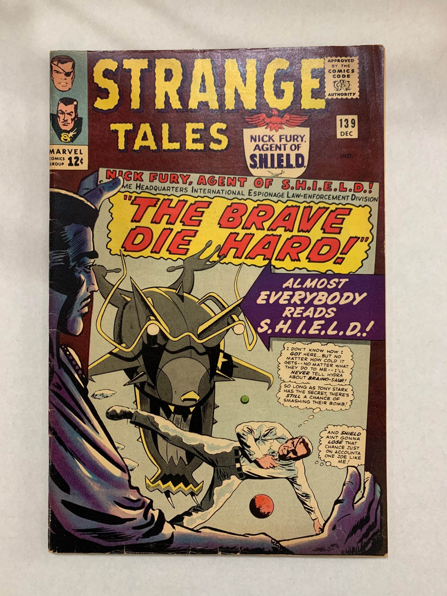 Cover pencils by Jack Kirby (layouts), Joe Sinnott, and Marie Severin (Dr. Strange figure), inks by Joe Sinnott and Marie Severin (Dr. Strange figure). Nick Fury stars in "The Brave Die Hard!", script by Stan Lee and Jack Kirby (co-plot), pencils by Jack Kirby (layouts) and Joe Sinnott, inks by Joe Sinnott; Hydra fails to learn the location of the Braino-Saur despite their Image-Inducer; Stark tells SHIELD's directors it was designed to disarm Hydra's Betratron Bomb orbiting above Earth; Agent G helps Fury escape but he refuses to promise not to harm her father, the Supreme Hydra; Dum Dum, Gabe and a SHIELD squad use the captured Hydra saucer to locate their HQ. "Beware...! Dormammu is Watching!", script by Steve Ditko (plot) and Stan Lee (dialogue), art by Steve Ditko; The Ancient One is revealed to be Dormammu's captive. Dr. Strange's mentor tells Strange he must fight on but can only expect token aid; Dormammu forces Clea to watch Strange's defeat. Strange and Mordo square off and battle; After a time, Dormammu grows frustrated at how Mordo has been out-fought and prepares to strike personally.