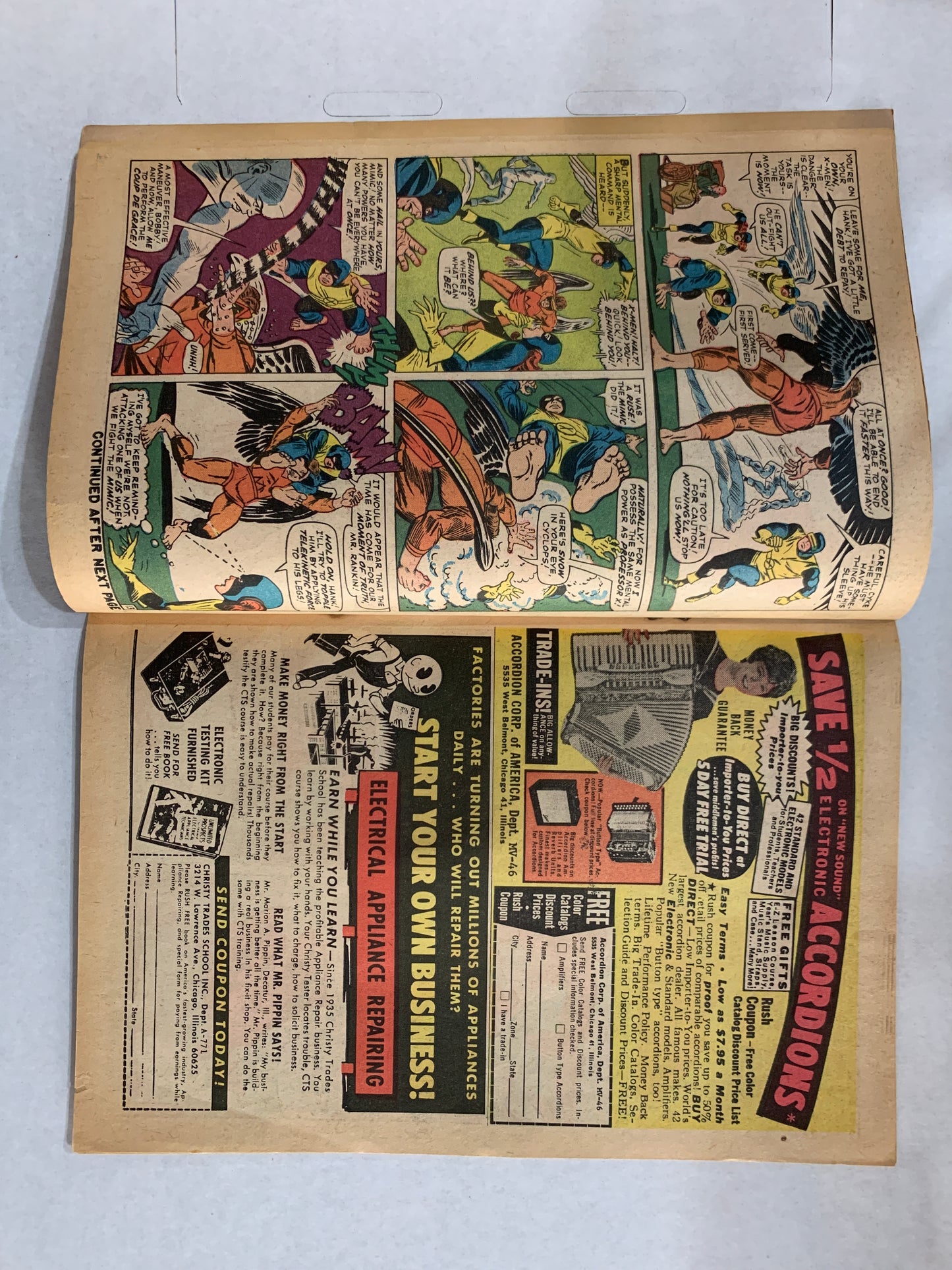 Cover pencils by Jack Kirby (layouts) and Werner Roth, inks by Dick Ayers. Lo! Now Shall Appear--The Mimic!, script by Stan Lee, pencils by Werner Roth (as Jay Gavin), inks by Dick Ayers; The X-Men are off to take a vacation when Bobby and Hank tussle with the mysterious Calvin Rankin who beats them by mimicking their powers; Calvin then has an encounter with Jean at a restaurant; Realizing he is dealing with the X-Men, Calvin follows Jean home and asks to join the X-Men; once he has absorbed all of their powers, however, he battles them and captures Jean; The team follows him to his secret hideout deep in an old mine where Mimic uses their combined powers to uncover a machine his father built that will allow him to keep the X-Men's combined powers for good; Realizing something at the last minute, Xavier allows Mimic to use the machine which doesn't give him powers but, rather, strips his mimic powers away; 1st appearance of the Mimic